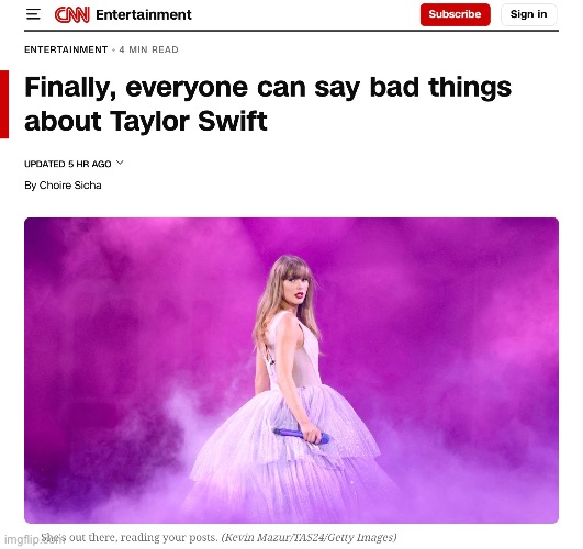 (6,122 posts)It's CNN, which has been normalizing a wannabe dictator for years, even allowing him to do a text interviews; now encouraging attacks on Swift with the title "Finally, everyone can say bad things about Taylor Swift". Completely, mean spirited on their part.