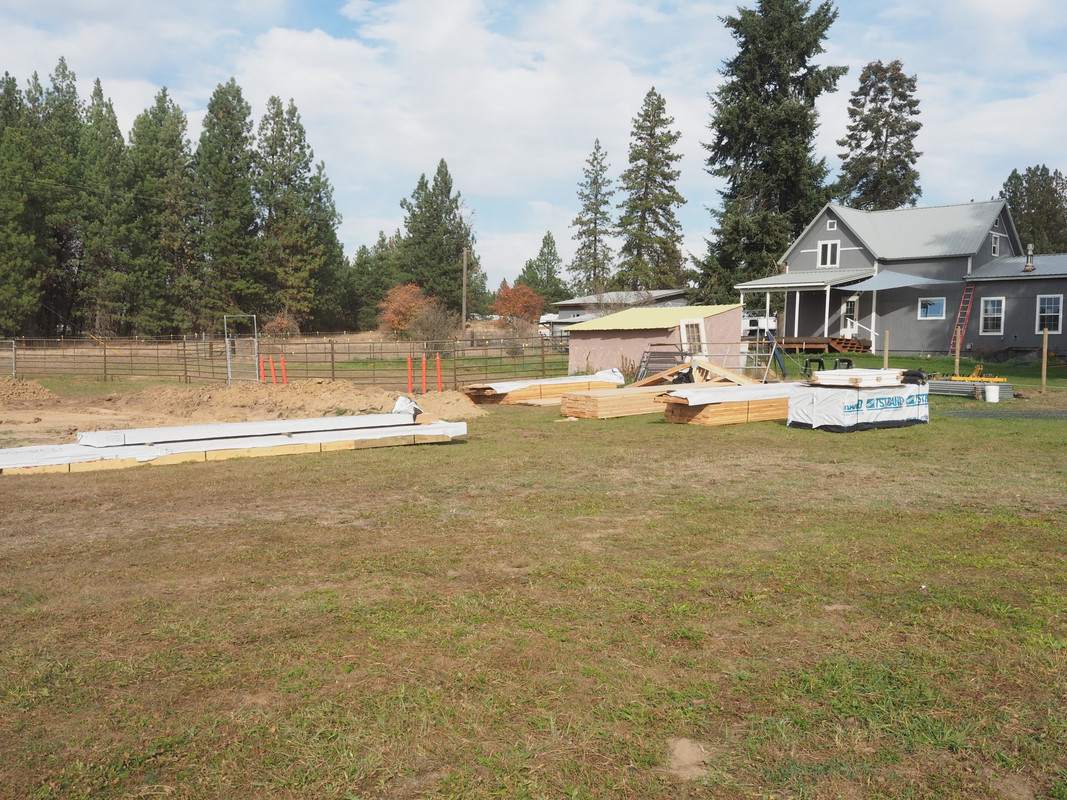Supplies are here, barn pole holes are dug. Builders & permits are behind schedule.